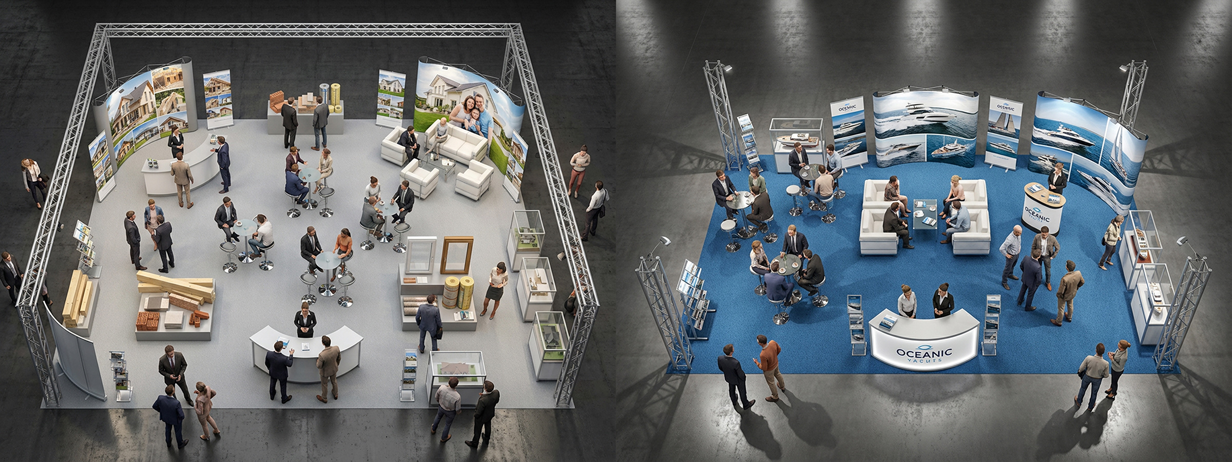 In modern exhibition stand construction, the digital twin serves as a central tool for maximum planning reliability and ecological sustainability by replacing physical prototypes with precise simulations. Our 3D solutions form the basis for this: They represent modular exhibition systems in meticulous detail and create a photorealistic atmosphere through physically accurate PBR materials and the use of IES lighting profiles. Technically, these assets are optimized for real-time rendering in high-end environments such as Unreal Engine 5 or Unity. Thanks to efficient low-poly structures, they enable high-performance VR walkthroughs and can be exported losslessly to formats such as glTF or USDZ for web-based presentations.