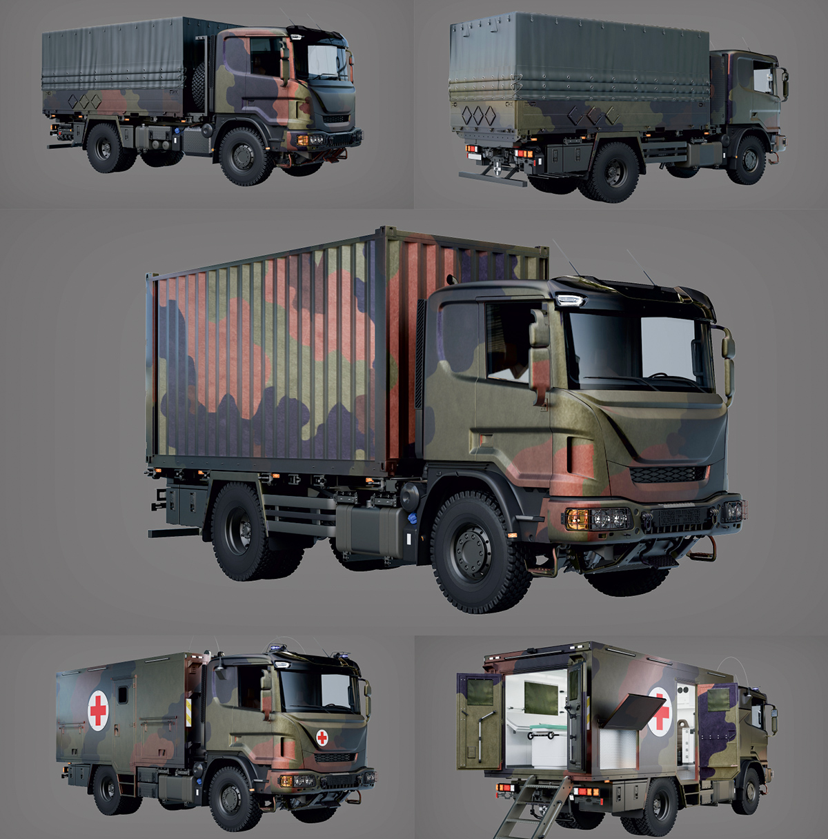 Product Visualization: A manufacturer of specialized tires, armored glass, communication antennas, or camouflage systems can use these neutral trucks to showcase their product on a "real-world" model without having to advertise a competitor's licensing model.