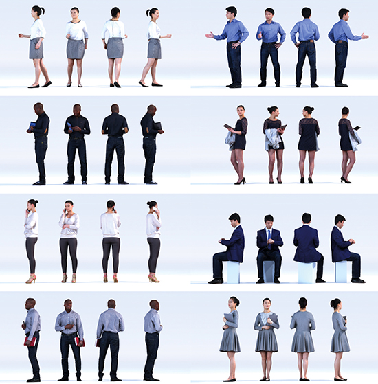 DOSCH 3D: People - Business Vol. 3 offers a selection of 10 photorealistic 3D models of men and women in business outfits. These models are ideal for designing office landscapes, modern workspaces (New Work Spaces), open-plan offices and banks. The 3D figures are available in sitting and standing poses and can be seamlessly integrated into professional working environments. Photorealistic 3D representations of people such as office workers, secretaries or civil servants bring life to the architectural visualizations of planned office and administrative buildings and enable clients to get a realistic idea of how the spaces will be used.