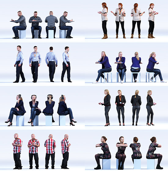 DOSCH 3D: People - Conference Room Vol. 1 contains 10 attractive women and men who, with their casual yet elegant clothing, are perfect for visualizing an event such as a conference, meeting or trade fair. The different poses of the 3D models such as sitting, standing, listening, writing or lecturing allow you to create a realistic situation.