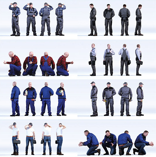 DOSCH 3D: People - Craftsmen Vol. 1 contains 10 different craftsmen in industry-specific workwear. The men in various standing and kneeling poses are suitable for visualizing craft activities.