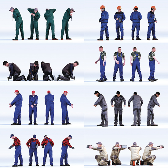 DOSCH 3D: People - Factory Worker Vol. 3 is a set of 10 realistic 3D-models of people designed for use in factory or industrial settings.