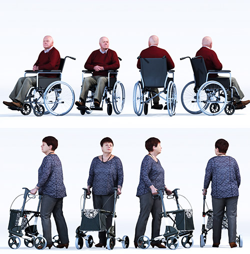 DOSCH 3D: People - Handicapped Seniors Vol. 1 is a set of high-quality 3D models that portray elderly people with disabilities in a realistic and compassionate manner.