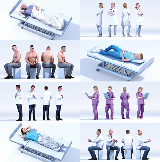 DOSCH 3D: People - Hospital Vol. 2 is a comprehensive set of 10 highly detailed and realistic 3D models of people specifically designed for use in hospital and healthcare settings.