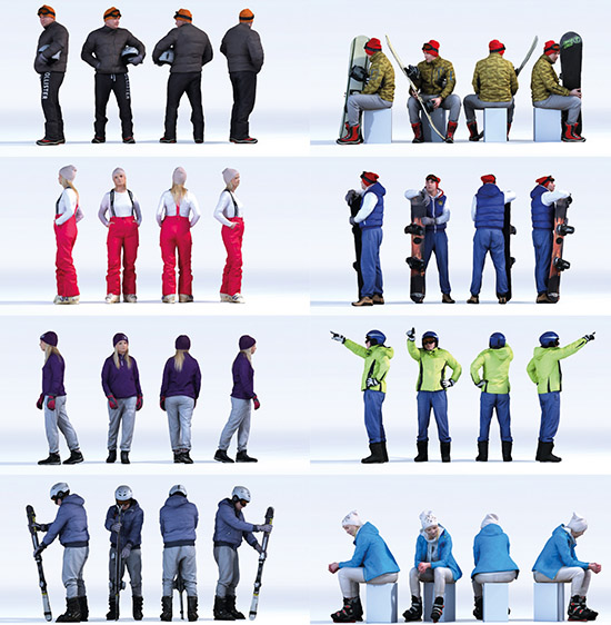 DOSCH 3D: People - Winter Sports Vol. 1 is a fantastic resource for those who want to create realistic winter sports scenes. It provides ten high-quality, fully textured 3D models that accurately depict people engaged in a variety of winter activities like skiing, snowboarding.