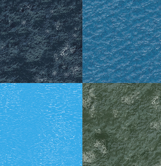 The product contains textures for a wide variety of water types such as oceans, swimming pools, rivers, waterfalls, calm and stormy sea surfaces as well as deep and shallow waters.