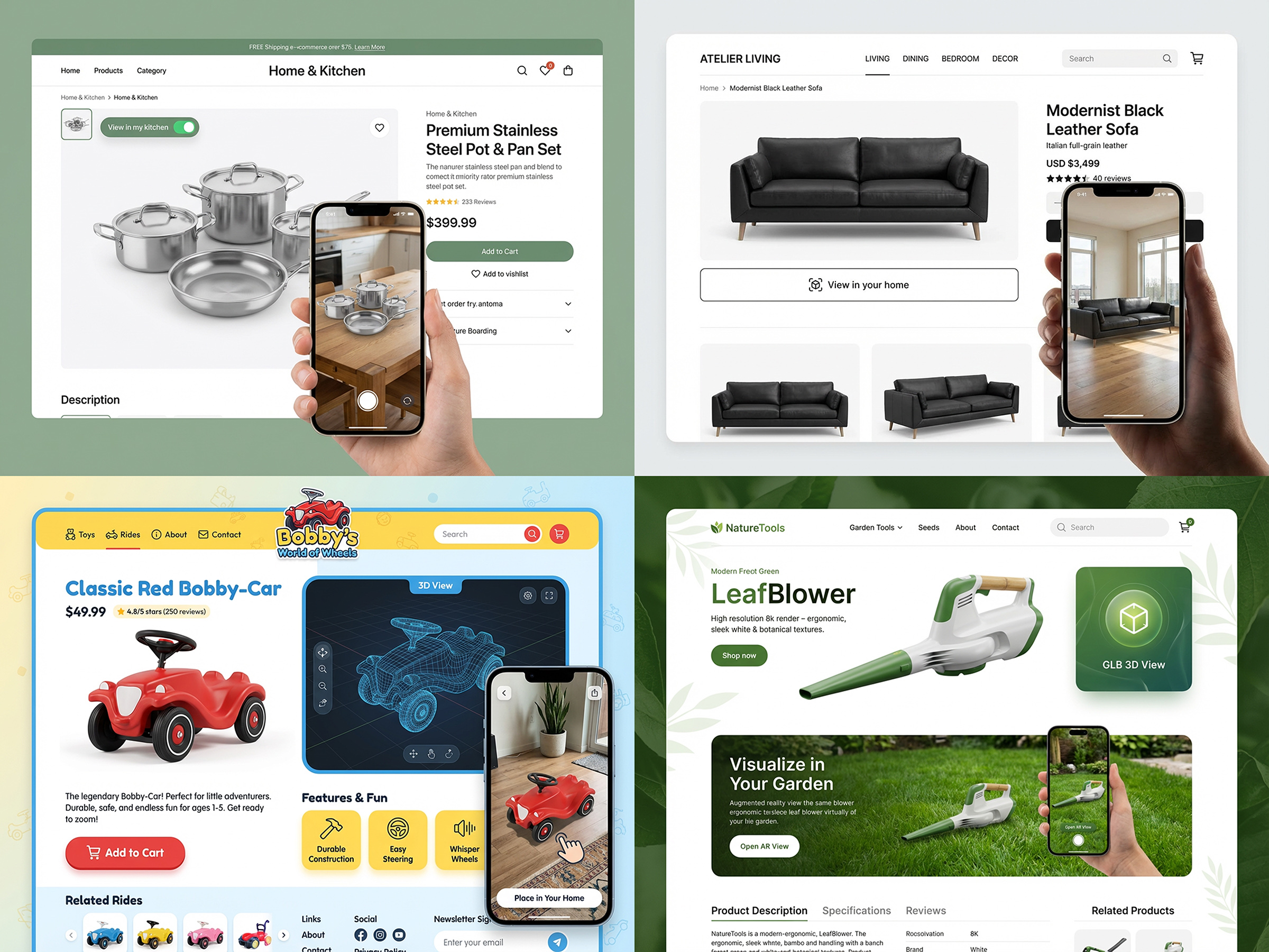 Customers click on "View in my room" and virtually place your product, true to scale, in their actual living space. Does the sofa fit in the corner? Does the coffee machine look too bulky on the countertop? Does the rug color match the floor? These questions are answered instantly – interactively and playfully. This creates a level of confidence in the purchase decision that a simple photo can never provide.