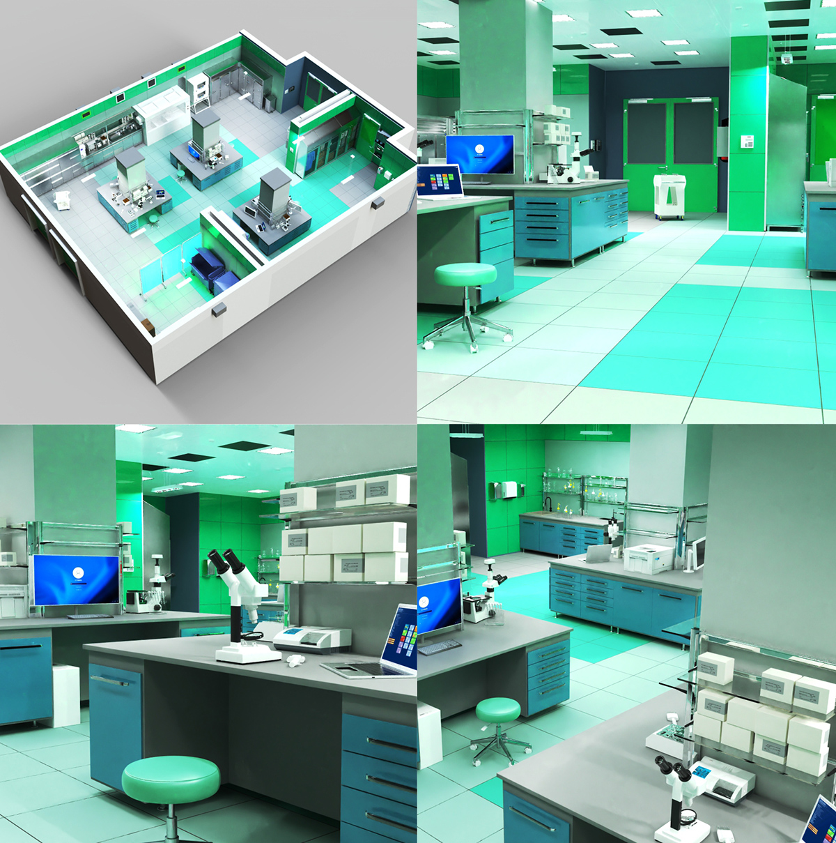 DOSCH 3D: 3D-Scenes - Clean Room 01 contains a very detailed and fully textured 3D-scene of a fully equipped cleanroom. Featuring precisely modeled furniture, technical equipment, and authentic interior design, this scene is ideal for visualizations in the fields of industry, research, production, medical technology, and architecture.