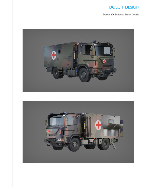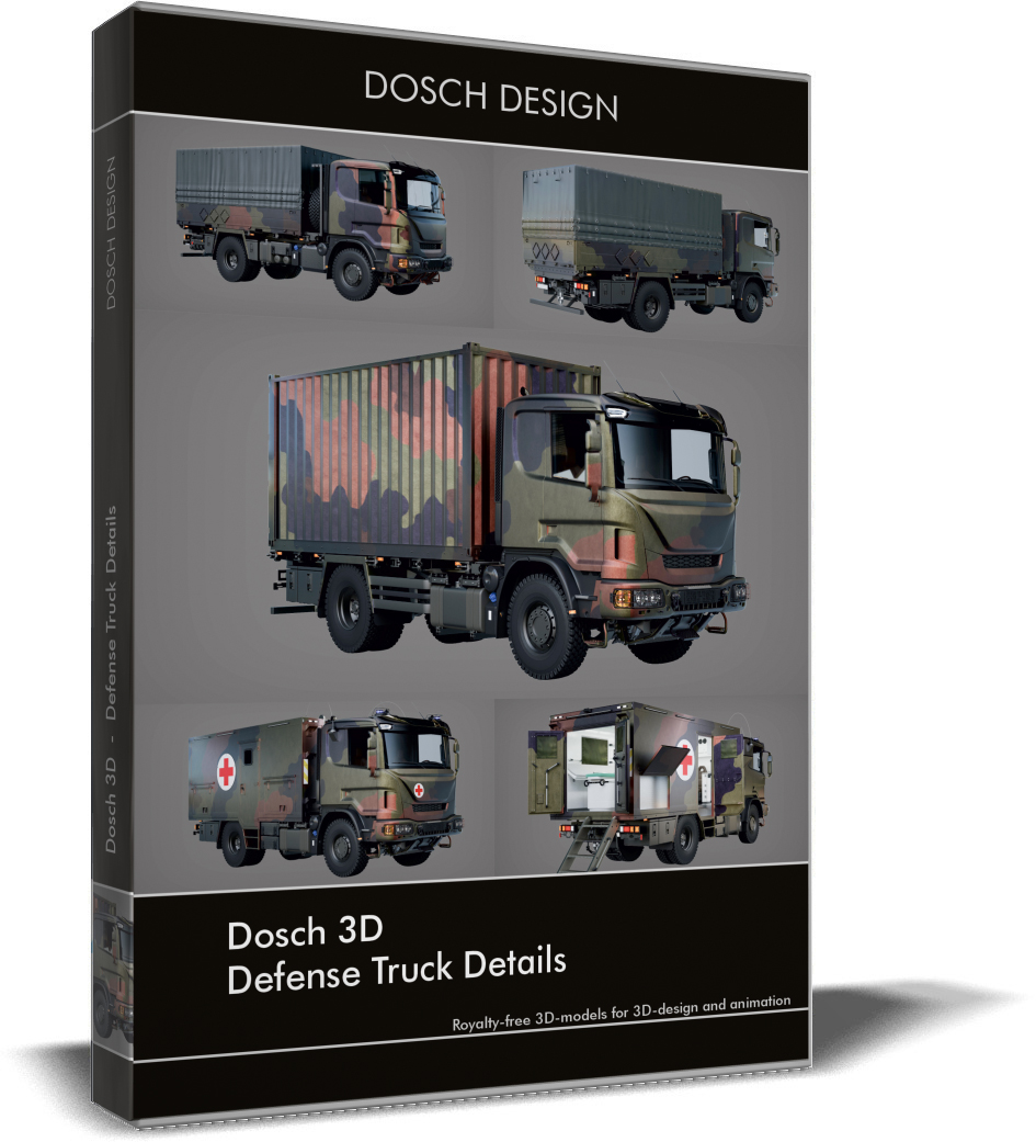 Dosch 3D: Defense Truck Details is a comprehensive collection of professional 3D models specifically designed for demanding visualization applications in the defense, security, and military logistics sectors. This product package offers three fully textured, highly detailed, and brand-neutral variants of a heavy all-terrain truck.