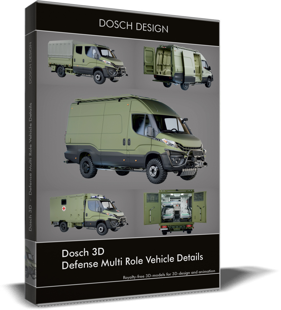 Dosch 3D: Defense Multi Role Vehicle Details ist eine umfassende Sammlung professioneller 3D-Modelle, die speziell für die anspruchsvolle Visualisierung im Bereich Verteidigung (Defense), Sicherheit und militärische Logistik entwickelt wurde. Dieses Produktpaket bietet drei vollständig texturierte, extrem detaillierte und markenneutrale Varianten eines Mehrzweckfahrzeugs für die Verteidigung.